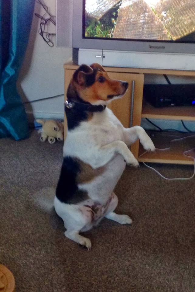 Before I go here is my Baby Belle this morning sitting pretty for Jake. He had a wee bit of cheese for her so she had to sit nice for it!!! Her tail is wagging so much its just a blur in the piccy!!!!